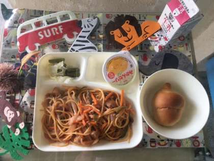イタリアンスパゲッティ、グリーンアスパラガスとキャベツのサラダ、みかんゼリーです。