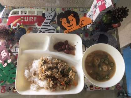 他人丼、とうがんのみそ汁、金時豆の煮ものです。