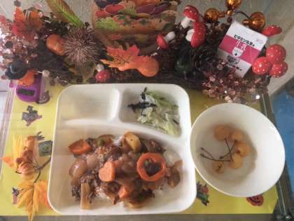 ハヤシライス、キャベツのひじきドレッシング、さくらんぼです。