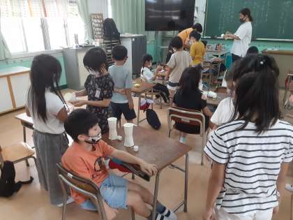 生活科で作ったおもちゃで遊びました。友だちに遊び方を上手に説明していました。