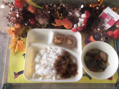 鶏肉のたつたあげ、一口がんもと野菜の煮もの、おかかなっ葉です。