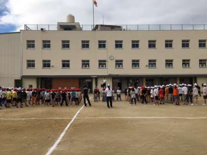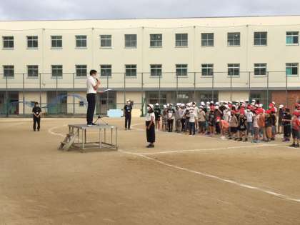 久しぶりに運動場で児童朝会を行いました。また、キックベースボール部の表彰も行いました。