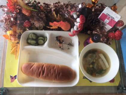 かつおのマリネ焼き、鶏肉とじゃがいものスープ、きゅうりのサラダです。