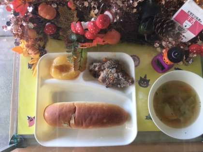 なすのミートグラタン、鶏肉と野菜のスープ、黄桃です。
