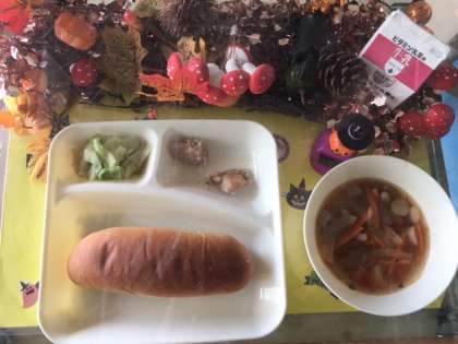 鶏肉の香草焼き、ウィンナーとてぼ豆のスープ、キャベツのガーリックソテーです。