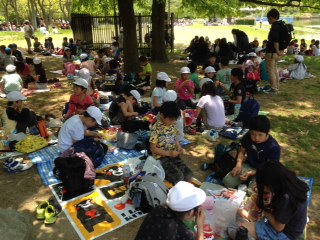 お昼のお弁当の様子です。芝生の広場の中に木陰を見つけ、そこにみんなでシートを敷き、食べました。