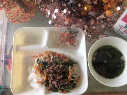 ビビンバ、わかめスープ、アーモンドフィッシュです。