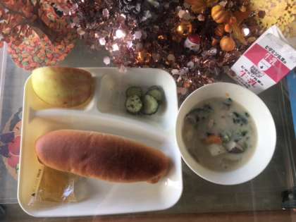 きのこのクリームシチュー、きゅうりのバジル風味サラダ、りんごです。