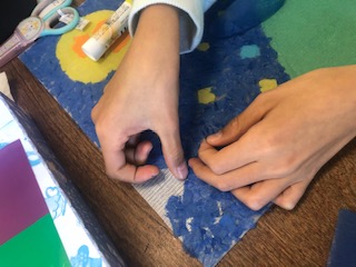 と考えながらボードにセロハンやお花紙を貼って作品を作りました。