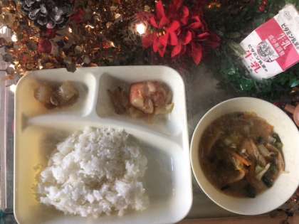 鶏肉の甘辛焼き、みそ汁、だいこんの煮ものです。