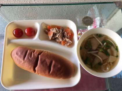 豚肉と野菜の煮もの、なにわうどん、プチトマトです。