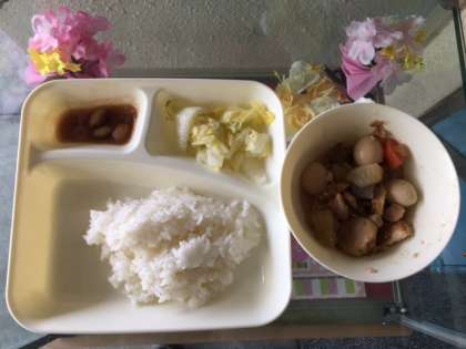 関東煮、はくさいの甘酢あえ、とら豆の煮ものです。