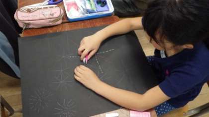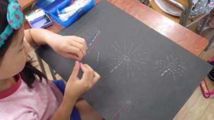 慣れてきたので、次は「花火」をイメージして、いろいろな色の糸で波縫いの練習をしました。子どもたちは1時間集中して取り組んでいました。