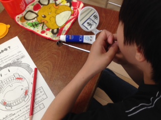 歯の保健指導週間です。4年1組の子どもたちは、本日、歯みがきについての指導を受けました。朝、ちゃんと歯をみがいたつもりでも、歯垢を染め出すと真っ赤です。“じょうずな歯みがき”は、なかなかむずかしいものですね。