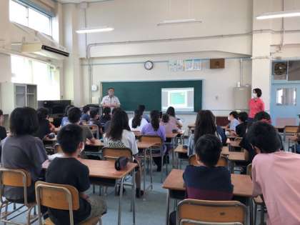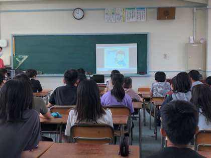 港警察署の方に来ていただき、非行防止教室を行っていただきました。スマートフォン・携帯電話の正しい使い方を中心に、学習しました。携帯電話は便利だけれど、使い方を間違えると、犯罪に巻き込まれたり友達に嫌な思いをさせたりすることがある、ということを、DVDを観ながら詳しく教えていただきました。