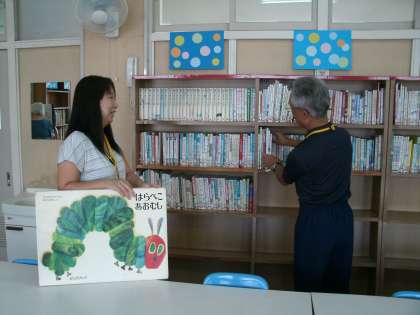 毎週火曜日、図書ボランティアのみなさんに図書館環境整備をおこなっていただいています。港晴小学校の図書館は2号館3階にあります。図書館が本に親しみやすい環境になるよう、図書の整理、掲示物の工夫等を行っていただいています。