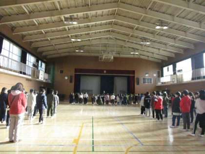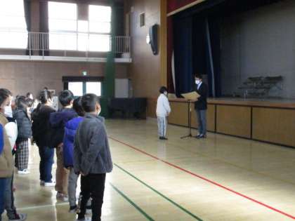 運動場の整備工事が始まり、1月末まで、朝会は講堂で行います。