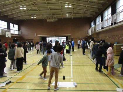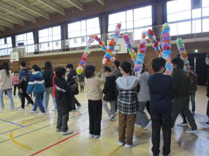 初めに、たてわり班で、文字を背中に書いていく伝言ゲームをしました。