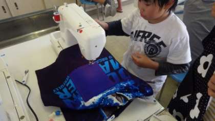 自分の選択した柄のエプロン布地を裁断して、三つ折りにしたり、ミシンで縫ったりと、徐々にエプロンの形に変化を遂げていく過程を楽しみながら夢中になって取り組みました。