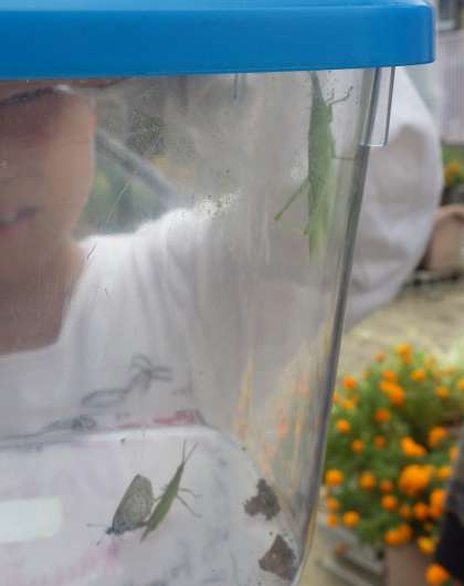 その結果、バッタ、チョウ、コオロギ、ガの幼虫、カナブンの幼虫を見つけることができました。