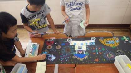 図画工作科の学習で班ごとに夜の遊園地の絵画を描きました。