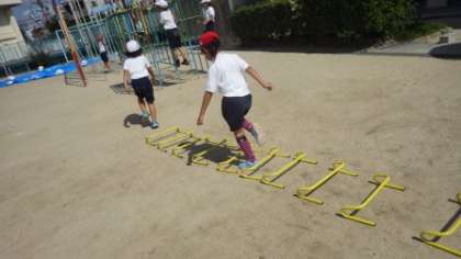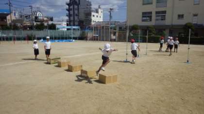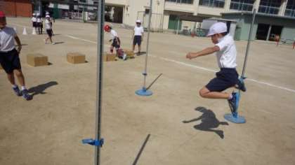 体育でとびあそびを学習しています。いろいろな道具を使って、いろいろな跳び方に挑戦しています。高さの違うゴムとび、ミニハードルをリズムよく跳ぶ、大きなダンボールを跳び越えるなど、子どもたちは自分で考えながら挑戦しています。次の学習ではどれだけ遠くに跳べるかを競うゲームに挑戦します。あそびの中で跳ぶ力を身につけていきたいと思います。