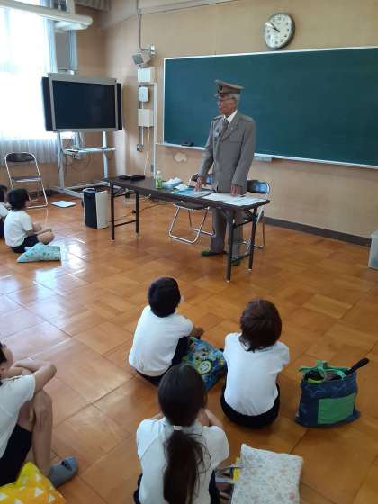 9月19日(火)2時間目に水防団の赤野様に港晴小学校にお越しいただき、港晴小学校と築港小学校の4年生が合同でお話を聞かせていただきました。赤野様のお写真とお話は、4年生の教科書にも記載されています。災害が起こった時に自分の命は自分で守ることやそのための準備をふだんからしておくことの大切さについて学びました。