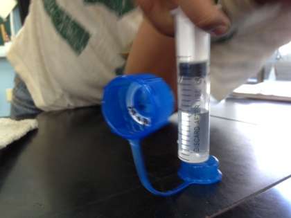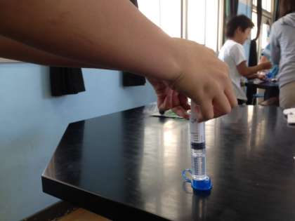 今日は、注射器の中に空気と水を入れておしちぢめる実験をしました。「おしちぢめられた空気はどのようになるのか?」「おしちぢめられた水はどのようになるのか?」という学習を既にしています。