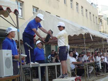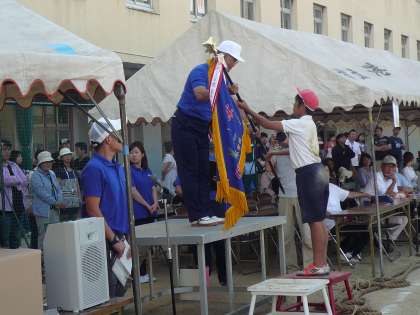 みんなで力を合わせて一生懸命がんばった運動会。応援団長に優勝旗・準優勝盾がわたされました。閉会式の子どもたちはどの子も達成感に満ちた表情をしていました。
