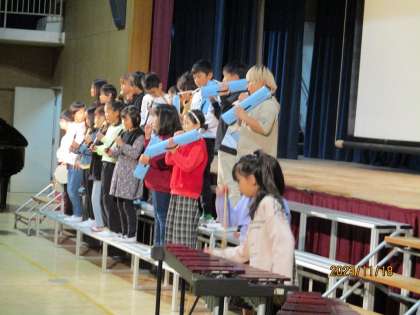 11月18日(土)に学習発表会がありました。2年前はコロナ禍で3学年ずつ発表会を行ったので、全校児童で行うのは久しぶりでした。緊張したと思いますが、劇、発表、合奏など、一人一人が堂々と自分の役割を果たすことができました。