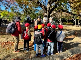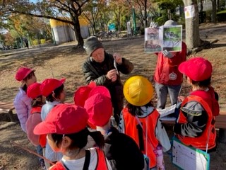 11月21日(火)、シニア自然大学そら組の方にお世話になり、八幡屋公園に秋みつけに行きました。どんぐりや落ち葉を拾ったり、オオバコずもうをしたり、セミの一生や紅葉のことを教えてもらったりしながら、いろいろな秋を見つけることができました。