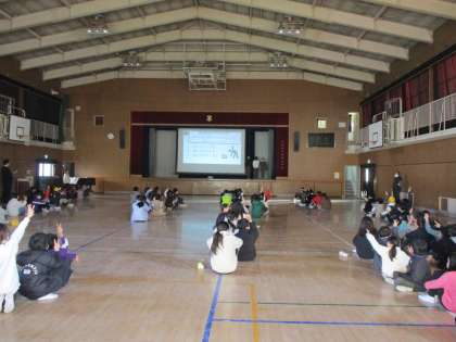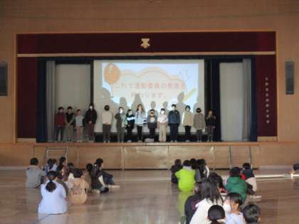 20分休み終了3分前の放送、運動会での体操、プールやスポーツテストの準備、遊具の片付けなどの仕事を動画で紹介した後、その仕事や行事に関する3択クイズをしました。竹でできている竹馬もありますが、学校の竹馬は鉄でできていますね!