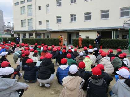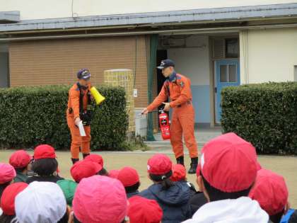 避難の様子については、「しゃべらず、勝手な行動をせず、素早く避難できていました。」と褒めていただきました。火災のときには、とにかく黒い煙を吸わないように、鼻と口をハンカチなどで覆い、低い姿勢で避難することが大切であることを教えていただきました。また、消火器の使い方も教えていただきました。