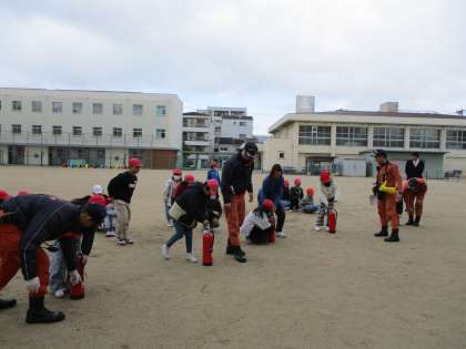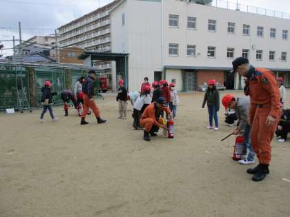 最後に、3年生が消火器訓練を行いました。粉の代わりに水が入った消火器を使って、訓練しました。安全栓を抜き、ノズルを持ってレバーを引くという手順を、落ち着いて行うことができていました。