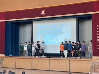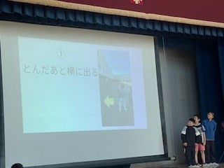 体育委員会の発表です。12月12日(木)に行われる大縄跳び大会に向けて、上手に跳べる方法をクイズ形式で発表していました。