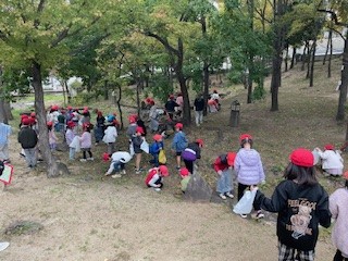 八幡屋公園にあきみつけに行きました。作品作りに使うドングリや落ち葉、枝を拾いました。学校に帰ってきて、作品作りをしました。