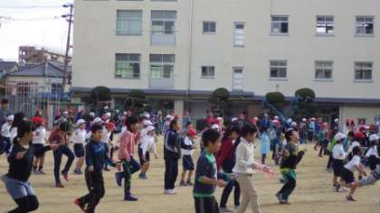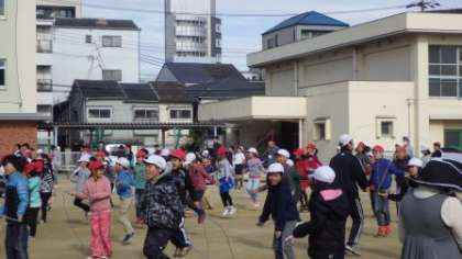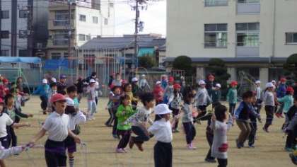 15分休憩に、全員がいっせいに運動場でなわとびをします。