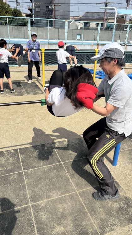 4年生の体育の授業で、鉄棒運動に取り組んでいます。この日は、校長先生が特別講師として登場し、「ダルマ回り」のコツを丁寧に教えてくださいました。