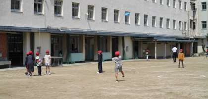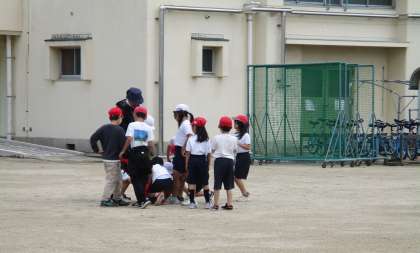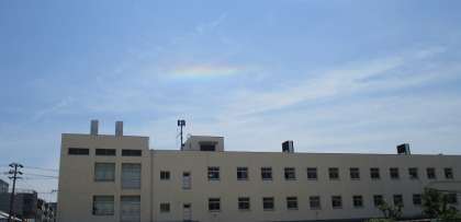 鬼ごっこをしていた子どもが、校舎の向こうに虹を見つけました。元気に遊んでいる子どもたちを見守っているようでした。