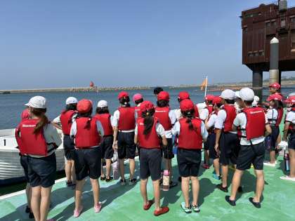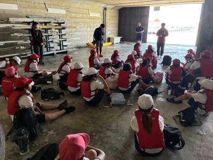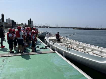 オールを力いっぱいこぎ、みんなで息を合わせて海にこぎ出します。