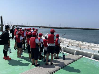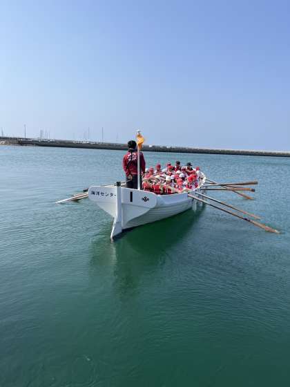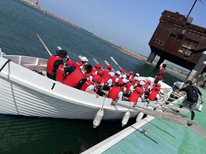 カッター訓練が始まり、海に出てオールを漕いでいます。