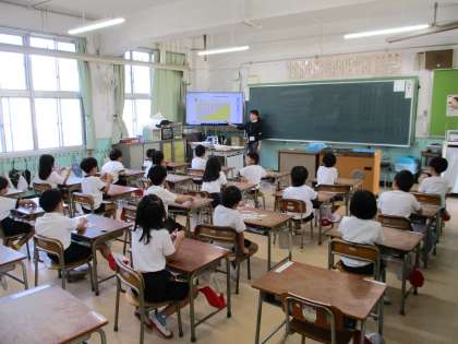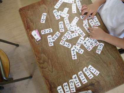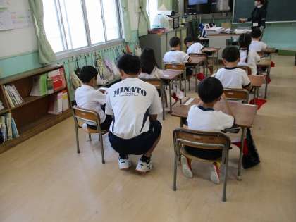 1年生の子どもたちが、計算カードを使って算数の学習に取り組んでいました。港中学校から職場体験学習に来ている卒業生のサポート受けながら取り組んでいる子どももいました。順番通りにうまく並べられたかな。