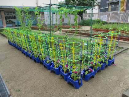 学習園の横を通ると、1年生が育てているあさがおが咲いているのを見かけました。よく見ると、奥にある学習園のなすやピーマン、ミニトマトも実をつけていました。自然や生命のすばらしさを感じた瞬間でした。