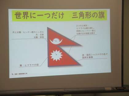 この日は、民族講師の先生をお招きして、ネパールのことについて学びました。ネパールの場所や地形の特徴、国旗の意味、言葉・食事・遊びといった文化等について、体験的な活動を通して熱心に学んでいる姿や自分の意見を思い思いに発言している姿は、とても活気に満ち溢れていました。