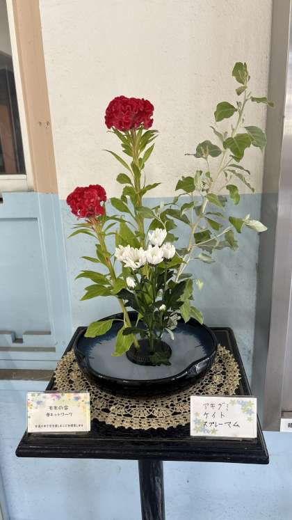 ももの会 港ネットワーク様より、アキグミ、ケイトウ、スプレーマムの花を玄関に生け込んでいただきました。