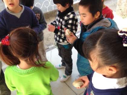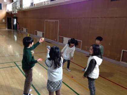 この日は、昨年度昔あそびを行った2年生から、1年生が昔あそびを教えてもらったり、一緒に遊んだりしました。普段から、交流のある学年同士なので、楽しく活動することができました。