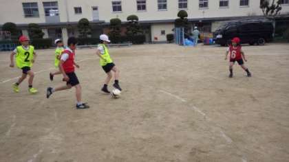 基礎的な「パス」「ドリブル」「シュート」の練習をみっちり行いましたので、みんな上達しています。かけ声も盛んに出ていました。まさしくチームプレイ!