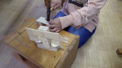 初めて金槌をつかって釘を打つのでなかなかまっすぐに打つことが難しいのですが、だんだん慣れてきて釘で飾りをつけるなど、工夫しています。