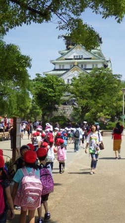 遠足前に学習した、1番大きなタコ石、珍しい「なんじゃもんじゃの木」など見学し、大阪城へ。外国の方も多く来られており、前日に習った英語で「ハロー」とあいさつ。返事をかえしてもらってミニ国際交流している子もいました。