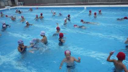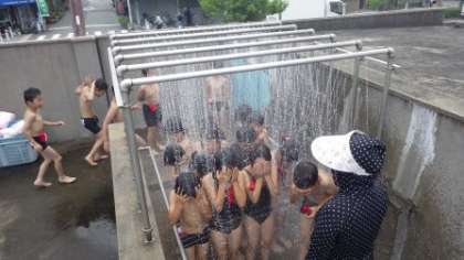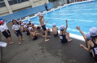 1年生も大きなプールにようやく慣れてきたようで、水の中でしっかり体を動かしています。この日は、1年対2年で「宝探し」対決です。なんと1年生の勝利!1年生の子ども達の大きな歓声が聞こえてきました。